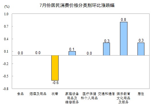 7月份,全國居民消費價格總水平環比上漲0.1%。其中,城市上漲0.1%,農村持平(漲跌幅度為0,下同);食品價格持平,非食品價格上漲0.2%;消費品價格下降0.1%,服務價格上漲0.6%。