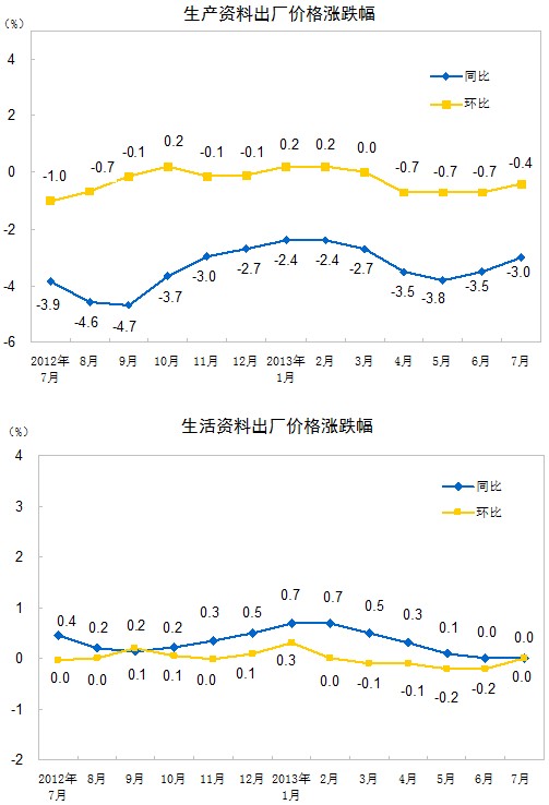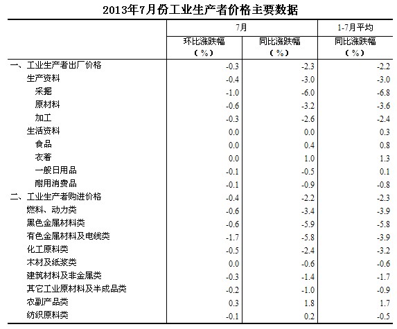 2013年7月份,全國工業生產者出廠價格同比下降2.3%,環比下降0.3%。工業生產者購進價格同比下降2.2%,環比下降0.4%。1-7月平均,工業生產者出廠價格同比下降2.2%,工業生產者購進價格同比下降2.3%。