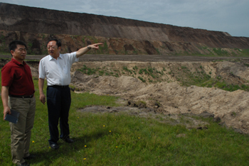 神寶能源董事長劉明(右)向北京環境交易所董事長杜少中介紹說,今年以來,神寶能源和內蒙古自治區、呼倫貝爾市、陳巴爾虎旗三級政府共同籌資4000多萬元,冒頂坑治理殲滅戰全面打響。記者