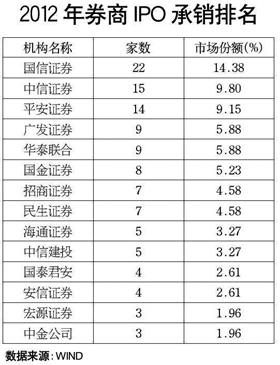 WIND統計數據顯示,在IPO保薦項目上,2012年全年,中金公司僅保薦了隆鑫通用、廣汽集團和吉艾科技,合計募集資金13.94億元,位列第17位;實現承銷及保薦費用收入合計1.31億元,位列第11位。其主承銷(首發、增發、配股及可轉債)收入合計2.61億元,市場份額為3.78%,位列第9位。而在2005年-2007年期間,憑借著強大的政府背景和在大型項目上突出的業務實力,當時的中金公司搶下了包括中國神華、中國人壽、建設銀行和工商銀行等許多大型項目的IPO,也為公司帶來了不菲的保薦和承銷費用。即使在2009年,中金公司也以10.9億元摘取承銷收入第一的桂冠,市場份額為20.64%。2010年,隨著創業板的推出,中金公司在IPO承銷市場一落千丈,承銷收入縮水至7億元,市場份額為4.13%;2011年,中金公司業績再度縮水,IPO承銷收入降至1.68億元,市場份額下滑到1.27%。
