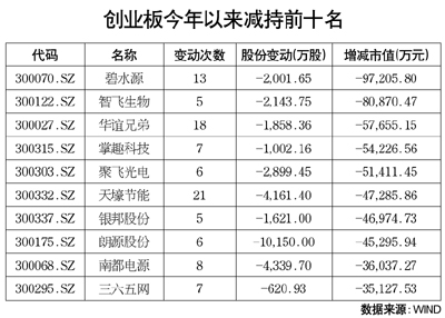從單個公司的情況來看,今年以來凈減持金額規模最大的分別為碧水源、智飛生物、華誼兄弟、掌趣科技、聚飛光電、天壕節能、銀邦股份、朗源股份、南都電源和三六五網,其凈減持金額分別達到了9.72億元、8.09億元、5.77億元、5.42億元、5.14億元、4.73億元、4.70億元、4.53億元、3.60億元和3.51億元。值得注意的是,上述10只創業板股票,也均是今年以來漲幅靠前的個股。其中掌趣科技今年以來上漲294.75%,位列創業板漲幅第二;華誼兄弟今年以來漲幅183.41%,位列第9位;聚飛光電今年以來漲幅163.38%,位列第14位。也就是說,就在這些創業板股票節節高升的同時,也正在為其股東提供前所未有的套現良機。