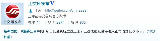 據上交所16日收盤后微博顯示,本所今日交易系統運行正常,已達成的交易將進入正常清算交收環節。