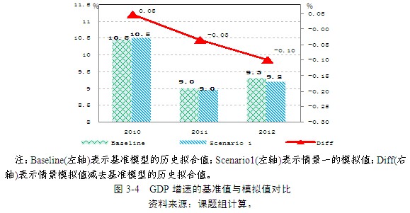 其次,宏觀經濟結構基本保持不變。在模擬的2010-2012年期間,居民消費占GDP的比重基本維持不變;固定資產形成總額占GDP比重則小幅上升,分別增加了0.05、0.12和0.18個百分點(圖3-5)。