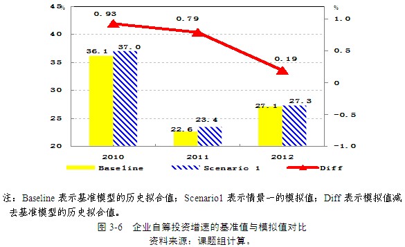第三,由于減少的非稅收入增加了企業收入,企業自籌資金的投資增速相對基準模型的歷史擬合值有較大的提高。2010-2012年,企業自籌資金的投資增速分別提高了0.93、0.79和0.19個百分點(圖3-6)。