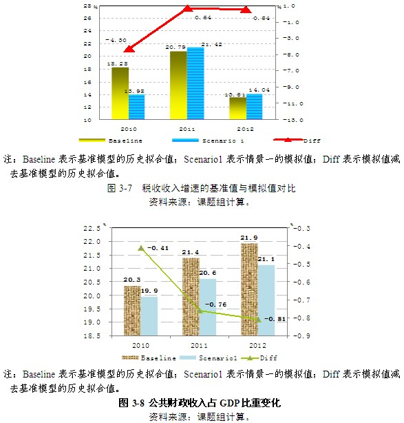 首先,降低非稅收入占比并將減少的非稅收入轉移給企業會輕微地降低GDP的增長率。在模擬期間,2010年GDP增速不降反升,較基準模型的歷史擬合值提高了0.05個百分點;2011年、2012年,GDP增速分別較基準模型的歷史擬合值下降了0.03和0.1個百分點(圖3-4)。受此影響,產出缺口在2010年降低0.04個百分點之后,開始小幅擴大;2012年,產出缺口相比提高了0.01個百分點。