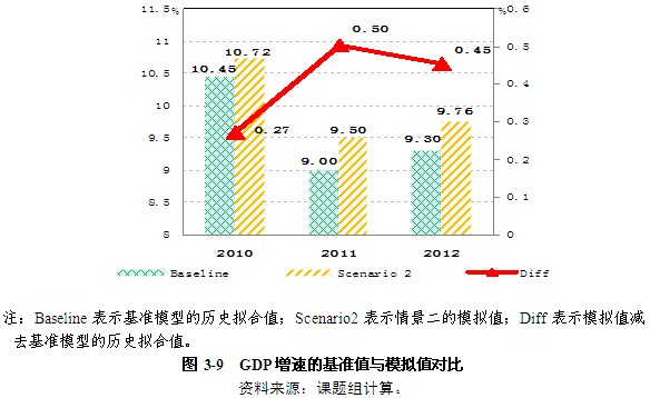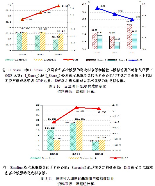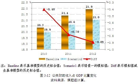 第三,得益于居民消費需求的擴大以及經濟增長的加快,企業自籌投資增速相較基準模擬水平也有所提高。同時,稅收收入增速也逐漸加快。與基準模型的歷史擬合值相比,在2010-2012年期間,稅收收入增速先降低3.98百分點,之后提高1.12、0.78個百分點(圖3-11)。財政總收入占GDP的比重分別下降0.4、0.78和0.89個百分點(圖3-12)。