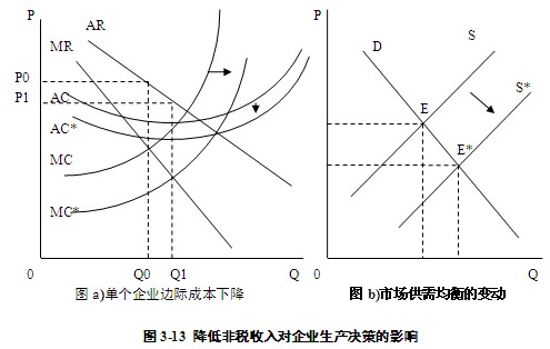 (1)現有的模型技術尚無法模擬降低對企業的非稅征收所導致的企業生產成本下降所引起的變化:由于企業的非稅負擔下降,企業的邊際成本下降,將推動企業生產擴張。在既定需求下,市場總供給將增加,產品價格將下降,企業利潤將上升,投資將增加,全社會的供需平衡點將向右下方移動,過剩的生產能力將得到更充分利用(圖3-13)。