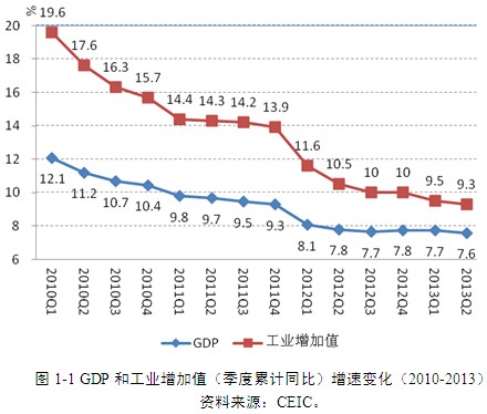 外部市場需求的萎縮以及近三年來過度投資所引發的產能過剩,使中國工業生產增速和國內生產總值(GDP)增速雙雙持續下降(圖1-1)。工業增加值(季度累計)的增速從2010年第一季度的19.6%下降到2013年第二季度的9.3%;同期,GDP(季度累計)增速也從12.1%下降到7.6%,雙雙創下了近三年來的最低增長速度。