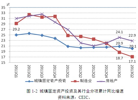 2013年上半年,城鎮固定資產投資累計增長20.1%,比上年同期小幅下降0.3個百分點。分行業看,上半年制造業投資累計增速為17.1%,比上年同期下降7.4個百分點,是近十年的最低增速;房地產業的投資累計增速為22.9%,比上年同期增加了0.8個百分點;交通運輸、倉儲及郵政業的投資累計增速為21.5%,比上年同期增加了23.5個百分點(圖1-2)。制造業投資累計增速的大幅下滑,是上半年實體經濟減速的一個重要表現,也同時反映了中國目前產能過剩的現實。