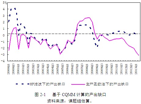 計算產出缺口的一種常用方法是利用H-P濾波計算實際產出與其趨勢(潛在產出)的缺口。圖2-1表明利用這種方法計算的產出缺口與現實存在著背離:近期中國經濟的產出缺口是正的,意味著不存在產能過剩的情況。然而,根據拓展后的CQMM的估算結果表明,自2009年起,中國經濟產出缺口就開始呈現出持續擴大的態勢。這說明,過去三四年期間應對金融危機而采用的擴張性政策導致中國經濟不僅存在行業結構上的產能過剩,而且還存在經濟總量上的產能過剩。