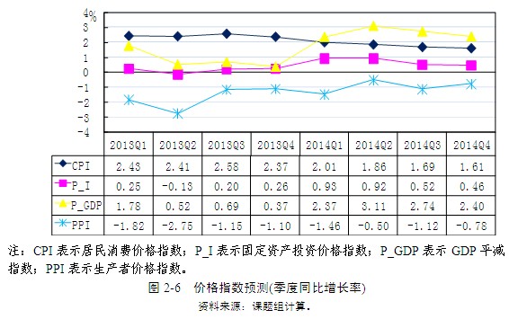 2013年GDP平減指數(P_GDP)將下降1.11個百分點,達到0.83%;2014年可能回升至2.65%。分季度看,2013年第三季度將回升至0.69%,之后持續下降,直至第四季度下降至0.37%;進入2014年,第一季度該指標將回升至2.37%,之后呈波動調整趨勢,并在第四季度達到2.40%(圖2-6)。
