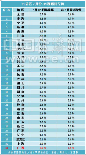31省區7月份CPI漲幅排行榜,青海第一,廣西居末,全國僅剩廣西物價處“1時代”。制表人 宋雅靜