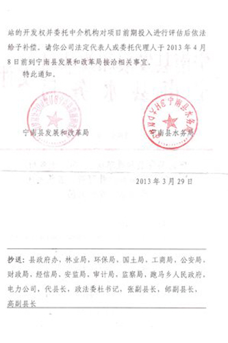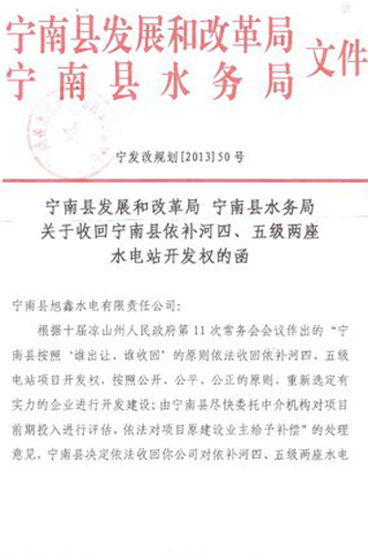 姚勇告訴記者,3月29日,寧南縣發改局、水務局所發出的寧發改規劃【2013】50號紅頭文件中“寧南縣決定依法收回你公司對依補河4、5級兩座水電站的開發權并委托中介機構對項目前期投入進行評估后依法給予補償”,其意思僅僅是告訴旭鑫公司政府將收回4、5級電站開發權,發函僅僅是請公司過來商議,并沒有對公司進行行政處罰和強制措施,縣發改局將在20日對是否收回4、5級電站舉行公開聽證。