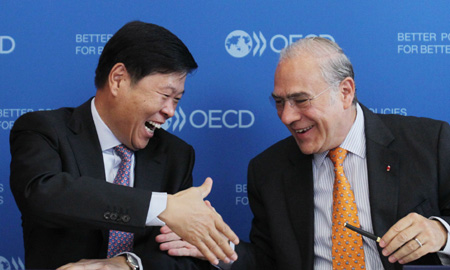 8月27日,在位于法國巴黎的經濟合作與發展組織(經合組織)總部,中國國家稅務總局局長王軍代表中國政府簽署《多邊稅收征管互助公約》,中國由此成為該公約第56個簽約方,為加強國際稅收合作、擴大國際稅收征收網絡和提高對跨境納稅人的稅收征管與服務水平邁出堅實一步。 圖為王軍(左)與經合組織秘書長安赫爾·古里亞在簽約儀式上握手。