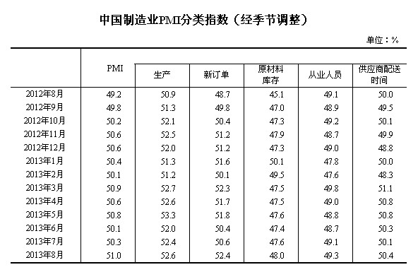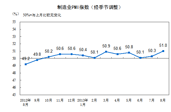 2013年8月,中國制造業采購經理指數(PMI)為51.0%,比上月上升0.7個百分點,連續11個月位于臨界點以上。