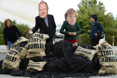 9月1日,在德國柏林大選電視辯論場外,抗議者戴著德國總理默克爾與反對黨社民黨總理候選人施泰因布呂克的面具。默克爾與施泰因布呂克主要圍繞最低工資制、稅收政策、幼兒看護政策、養老和醫療保險、能源轉型、希臘債務以及敘利亞局勢等話題展開。特別是德國一再對南歐小國希臘的援助,讓德國人有些不耐煩,反對黨一直指責政府隱瞞希臘債務風險的真相。民調顯示,施泰因布呂克在整場辯論中略占上風。