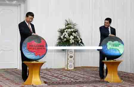 9月4日,國家主席習近平同土庫曼斯坦總統別爾德穆哈梅多夫共同出席中國石油天然氣集團公司承建的土庫曼斯坦“復興”氣田一期工程竣工投產儀式。這是習近平同別爾德穆哈梅多夫出席“復興”氣田第一天然氣處理廠投產儀式。
