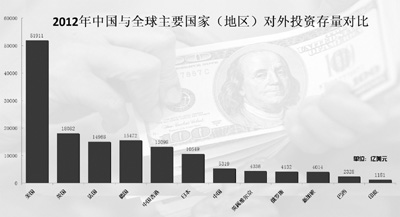 據統計,截至2012年底,中國對外直接投資累計凈額(存量)達5319.4億美元,位居全球第13位。