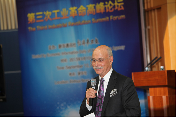 第三次工業革命高峰論壇上午在北京開幕,里夫金正在進行主題演講