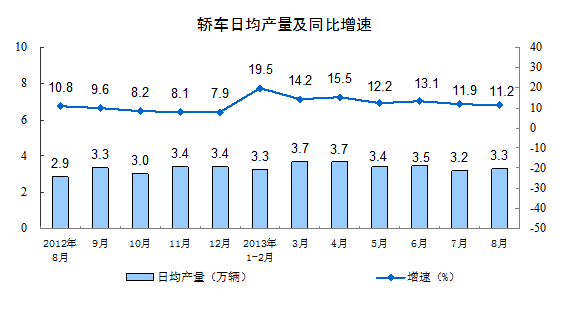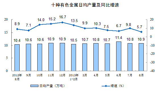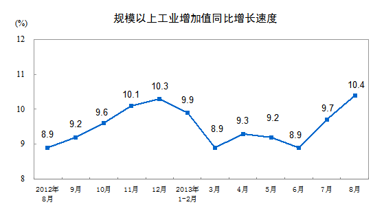 國家統計局10日公布數據,2013年8月份,規模以上工業增加值同比實際增長10.4%(以下增加值增速均為扣除價格因素的實際增長率),比7月份加快0.7個百分點。從環比看,8月份,規模以上工業增加值比上月增長0.93%。1-8月,規模以上工業增加值同比增長9.5%。