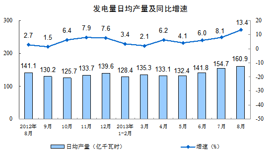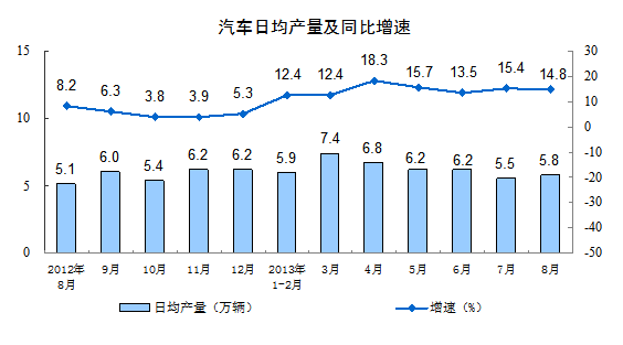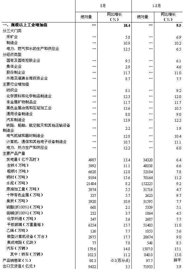 分行業看,8月份,41個大類行業中有39個行業增加值保持同比增長。其中,紡織業增長8.1%,化學原料和化學制品制造業增長12.3%,非金屬礦物制品業增長11.7%,黑色金屬冶煉和壓延加工業增長13.6%,通用設備制造業增長8.0%,汽車制造業增長13.9%,鐵路、船舶、航空航天和其他運輸設備制造業增長2.2%,電氣機械和器材制造業增長12.8%,計算機、通信和其他電子設備制造業增長10.7%,電力、熱力的生產和供應業增長12.2%。