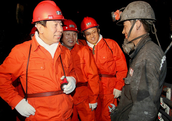 神華集團公司董事長張喜武在井下檢查煤炭安全生產!≠Y料照片 |