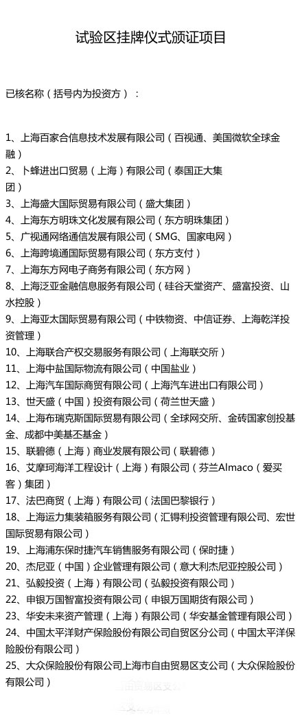 正式掛牌,上海百家合信息技術發展有限公司、東方明珠集團、上海聯交所等首批25家企業入駐自貿區。