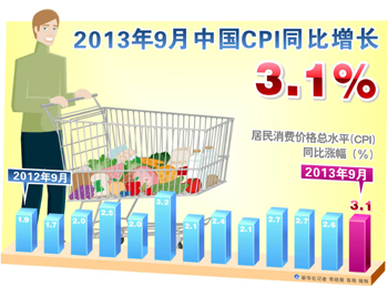 國家統計局14日發布,9月全國居民消費價格總水平(CPI)同比上漲3.1%,漲幅創下7個月新高,高于8月0.5個百分點,高于此前平均預期0.2個百分點。