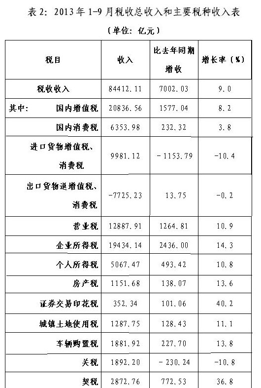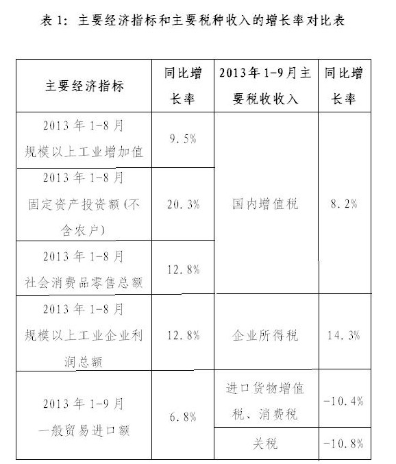 前三季度稅收收入平穩增長的主要原因:一是去年同期基數較低。2012年前三季度,國內經濟增長緩慢,增值稅、企業所得稅同比分別增長5.8%和14.7%,遠低于往年增長速度;受政策調整影響,去年同期個人所得稅同比下降8.4%。二是前三季度經濟形勢有所好轉。1-8月,規模以上工業增加值、固定資產投資額(不含農戶)、社會消費品零售總額、規模以上工業企業利潤總額同比分別增長9.5%、20.3%、12.8%和12.8%。三是房地產交易活躍、價格上漲等因素使得相關稅種收入高速增長。1-8月,商品房銷售額同比增長34.4%,契稅、房地產營業稅同比分別增長36.8%和37.4%。