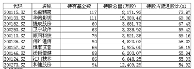 WIND統計數據顯示,作為機構投資者的公募基金,由于今年以來不斷地對創業板進行增持,在部分創業板股票中其整體持股比例已經達到了十分高的地步。從2013年中報的全部持股數據來看,公募基金共對355只創業板股票中的296只有持倉,持股總市值達到1148億元;鸬恼w持股占到了流通股比例在30%以上、實現輕度控盤的企業就多達51家。其中,公募基金持有的長盈精密已經占到了流通股的73.97%,華策影視、捷成股份、衛寧軟件、順網科技等13家創業板企業中,公募基金對流通股的持股比例也均達到50%以上。