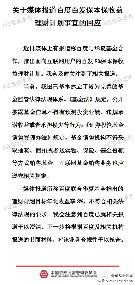 媒體報道所稱百度聯合華夏基金推出的理財計劃目標年化收益率8%,不符合相關法律法規的要求。我會注意到百度已就相關報道予以澄清,下一步將根據百度及相關機構報送的書面材料,對該業務合規性予以核查。