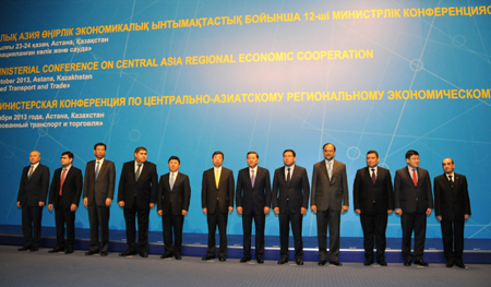 10月24日,中亞區域經濟合作第12次部長級會議在哈薩克斯坦首都阿斯塔納舉行。來自哈薩克斯坦、中國等中亞區域經濟合作機制成員國的部長級官員,以及來自世界銀行、國際貨幣基金組織的代表出席會議。本次會議將規劃下年度中亞區域經濟合作發展,重申中亞各國在交通、貿易、互惠政策、能源開發等領域加強合作的重要性。當天,會議在上述四個領域規劃了逾100個項目,總價值超過150億美元。 圖為出席當日會議的代表們。