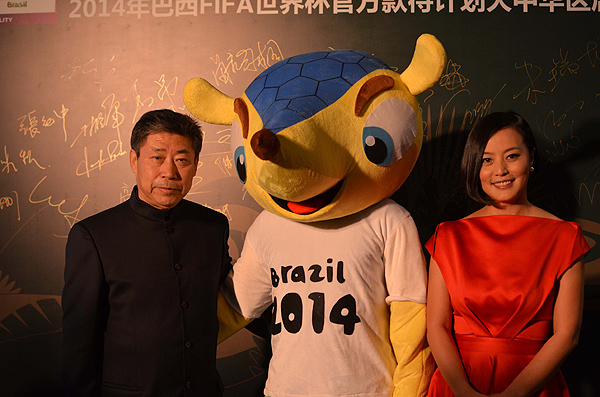 國際足聯執委張吉龍先生(左)、盛開國際體育董事長李紅女士(右)與巴西世界杯吉祥物人偶在啟動儀式上合影。