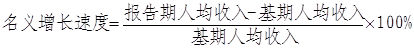 名義增長速度。主要反映居民持有貨幣收入的增減變化情況。計算方法是用報告期居民人均收入減去基期居民人均收入再除以基期居民人均收入。計算公式為: