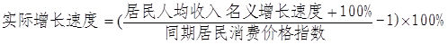實際增長速度。主要反映居民持有貨幣收入所能形成的實際購買力增減變化情況。計算方法是在居民人均收入名義增長速度中扣除同期的居民消費價格指數。計算公式為: