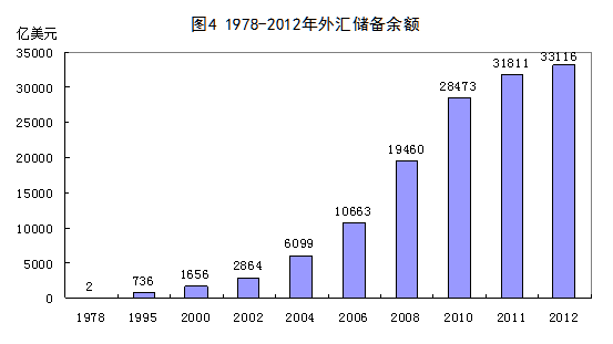 外匯儲備大幅增長,實現從外匯短缺國到世界第一外匯儲備大國的巨大轉變。1978年,我國外匯儲備僅1.67億美元,位居世界第38位,人均只有0.17美元,折合成人民幣不足1塊錢。隨著我國對外經濟的發展壯大,經常項目貿易盈余不斷積累,外匯儲備的短缺迅速成為歷史,1990年外匯儲備超過百億美元,達到111億美元,1996年超過千億美元,達到1050億美元,2006年超過1萬億美元,達到10663億美元,超過日本位居世界第一位,2011年超過3萬億美元,2012年達到33116億美元,連續七年穩居世界第一位。