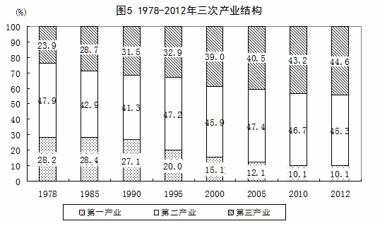 產業結構不斷優化。35年來,三次產業在調整中均得到長足發展,農業基礎地位不斷強化,工業實現持續快速發展,服務業迅速發展壯大。1979-2012年,第一、二、三產業增加值年均實際分別增長4.6%、11.3%和10.8%。三次產業增加值在國內生產總值中所占的比例由1978年的28.2:47.9:23.9調整為2012年的10.1:45.3:44.6。與1978年相比,2012年第一產業比重下降18.1個百分點,第二產業比重下降2.6個百分點,第三產業比重大幅上升20.7個百分點。