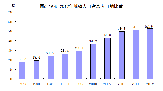 城鎮化步伐明顯加快。城鎮化水平由1978年的17.9%上升到2012年的52.6%,上升了34.7個百分點,年均上升1.0個百分點。城鎮總人口年均增加1586萬人,鄉村總人口年均減少435萬人。城鎮化水平的提升促進了城鄉經濟的協調發展,有利于居民消費結構升級,并不斷催生新的經濟增長點,是擴大內需的最大潛力所在。隨著城鎮化和工業化進程的加快,城鎮吸納就業的能力也不斷增強。城鎮就業人員占全國的比重從1978年的23.7%上升到2012年的48.4%,鄉村就業人員占比從76.3%下降51.6%。