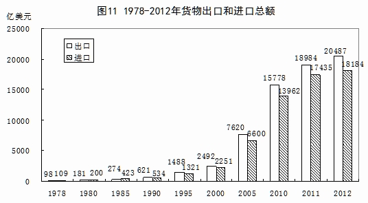 對外貿易總量不斷攀升。改革開放初期,我國對外經濟交流活動十分有限,再加上國內市場化水平不高,造成了與國際市場相對隔絕的狀態。1978年,我國貨物進出口總額只有206億美元,世界排名第29位,1988年突破了1000億美元,1994年突破了2000億美元,1997年突破了3000億美元,2004年又突破了1萬億美元大關,2012年,貨物進出口總額已達到38671億美元,比1978年增長186倍,年均增長16.6%,僅次于美國,位居世界第二位;貨物出口總額20487億美元,增長209倍,年均增長17.0%,居世界第一位;貨物進口總額18184億美元,增長166倍,年均增長16.2%,居世界第二位。2012年,我國貨物出口總額和進口總額分別占世界的11.2%和9.8%。