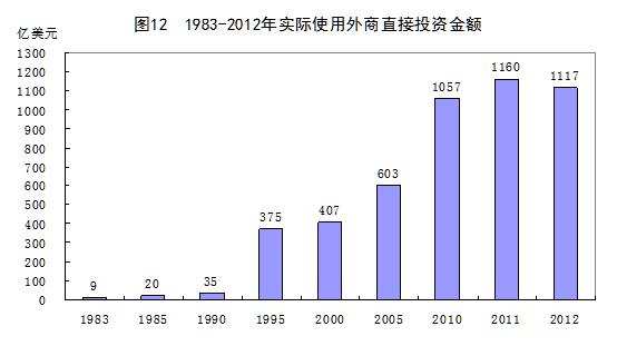 引進外資與對外投資活動日益頻繁。改革開放以來,我國充分發揮了資源、勞動力等要素優勢和巨大的潛在市場優勢,成為國際直接投資的熱土,利用外資規模不斷擴大,外商直接投資成為推動我國經濟發展和技術進步的重要力量。1979-2012年,實際使用外商直接投資12761億美元,1984-2012年以年均18.0%的高速度增長。我國已連續多年成為吸收外商直接投資最多的發展中國家,世界排名也上升至第二位。近些年來,隨著我國企業實力的提升,“走出去”的步伐開始加大。中國對外直接投資凈額由2007年的265億美元快速提高到2012年的878億美元,2012年末對外直接投資存量達到5319億美元。