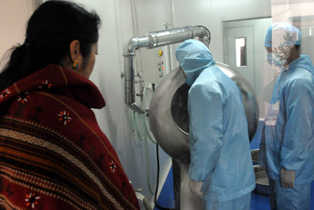 專家學者、宗教界人士和醫護人員代表日前齊聚一堂,共同慶祝北京藏醫院成立20周年,并參觀北京藏醫院新設立在北京市昌平區南口鎮的藏藥研究和加工機構。目前,北京藏醫院制作了500余種藏藥材標本,根據國家要求開始制定藏藥標準,旨在為藏醫藥發展打下堅實的基礎。圖為與會者在參觀北京藏醫院南口基地的藏藥生產。