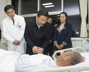 習近平在青島大學附屬醫院黃島分院看望慰問傷員 |