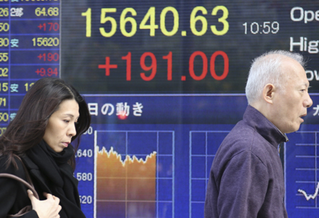 受隔夜美股再創新高及日元匯率大幅回跌等利好因素提振,28日東京股市大幅走高,日經225種股票平均價格指數比前一個交易日上漲1.8%,創近六年來最高。當天收盤時,日經股指上漲277.49點,報收15727.12點。東京證券交易所股票價格指數上漲13.96點,報收1261.04點,漲幅為1.12%。 圖為28日,在日本東京,行人經過一家證券公司外的電子股票顯示屏。