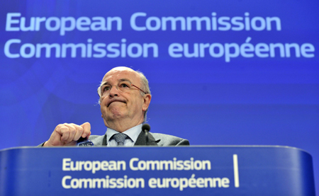 歐盟4日對8家金融機構開出創紀錄的17億歐元罰單,因為這些金融機構操縱了歐洲銀行間歐元同業拆借利率和日元東京銀行間同業拆借利率。其中,德意志銀行因涉嫌操縱這兩種利率被開出最大罰單,為7.25億歐元。圖為歐盟負責競爭事務的委員華金·阿爾穆尼亞在4日的發布會上發言。
