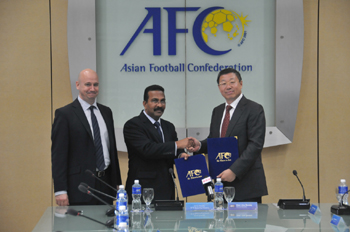 青島啤酒副總裁兼營銷總裁王瑞永代表青啤與亞足聯秘書長亞歷克斯簽約。 |