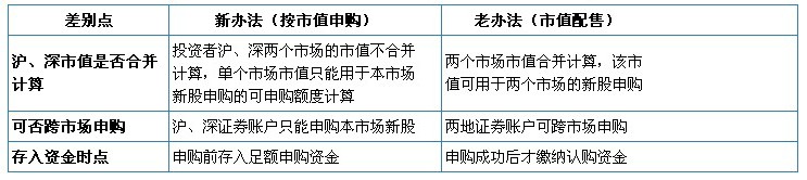 答:按市值申購(簡稱“新辦法”)要求“市值分市場計算、分賬戶申購新股、資金足額才能申購”;市值配售(簡稱“老辦法”)則規定“市值合并結算、賬戶可跨市場申購、中簽后交付資金”。具體解釋如下: