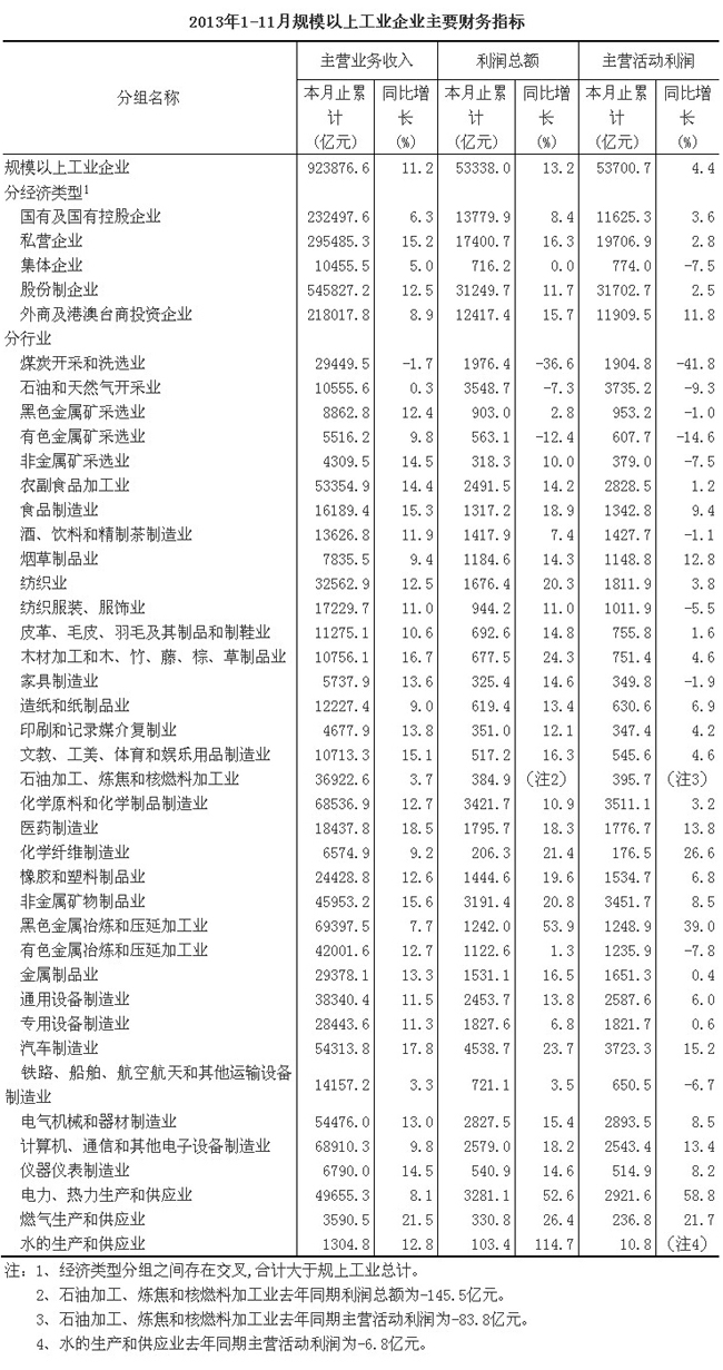 1-11月份,全國規模以上工業企業實現利潤總額53338億元,比去年同期增長13.2%,增速比1-10月份回落0.5個百分點,其中,主營活動利潤[1]53700.7億元,比去年同期增長4.4%,增速比1-10月份回落1個百分點。
