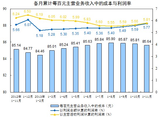 1-11月份,規模以上工業企業實現主營業務收入923876.6億元,比去年同期增長11.2%。每百元主營業務收入中的成本為85.64元,以利潤總額計算的利潤率為5.77%,以主營活動利潤計算的利潤率為5.81%。