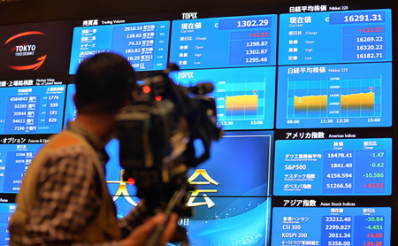 12月30日,受日元對美元匯率創5年零3個月以來新低等因素提振,日經225種股票平均價格指數繼續走高,在今年最后一個交易日創下六年來新高。截至收盤時,日經股指上漲112.37點,漲幅為0.69%。東京證券交易所股票價格指數上漲12.22點,報收1302.29點,漲幅為0.95%。 圖為當日一名攝像師在東京證券交易所拍攝電子屏幕。