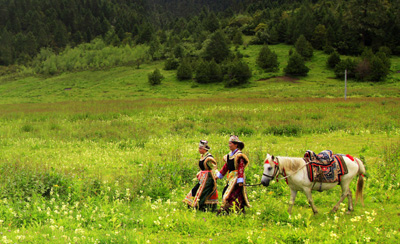 兩位林芝女子牽馬行走在林芝境內的“魯朗花!